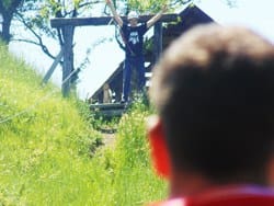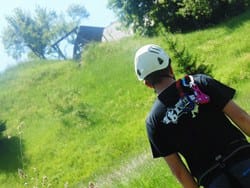 Extremna vožnja u alpinistićkoj opremi na sajli dužine 200 metara. <br />Brzina oko 60 km/h.